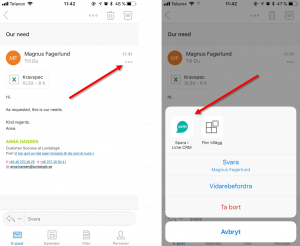 If running Office 365 - the Lime CRM add-on also works through the Outlook app for iOS. You access the add-on by pressing the small three dots in the header when opening an e-mail.