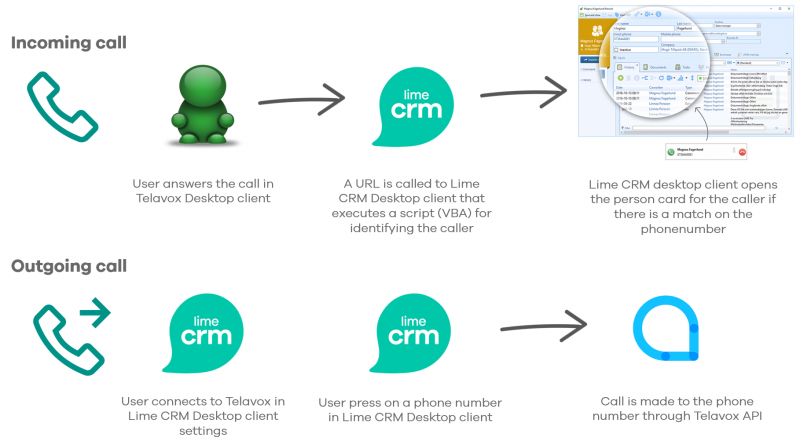 The Telavox-to-Lime and Lime-to-Telavox integration handles incoming and outgoing calls from/to Lime CRM Desktop Client through Telavox Desktop Client.