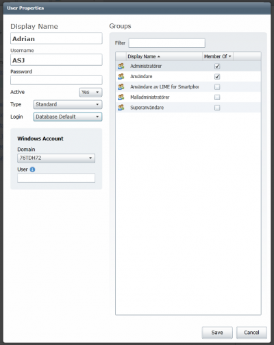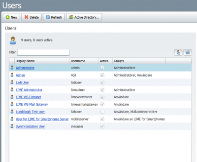 When selecting users, you can add/delete/edit users and which groups they are in. It's also possible to trigger a synchronization with the AD. To read more about the active directory integration see below.