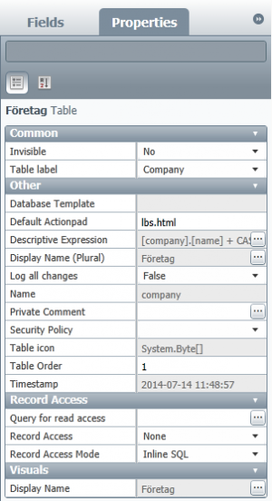 If you open a table in LISA you will get a graphical representation, similar to how it will look in Lime CRM. Once the table is opened, click anywhere in the header on the table and you can choose properties for the table to the right. Besides the properties you specified when you created the table, you can also choose for example where in LIME the table should appear (“Table Order”) and which actionpad should be the default (the html-area to the left when you open an object for this table in LIME).