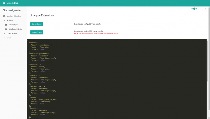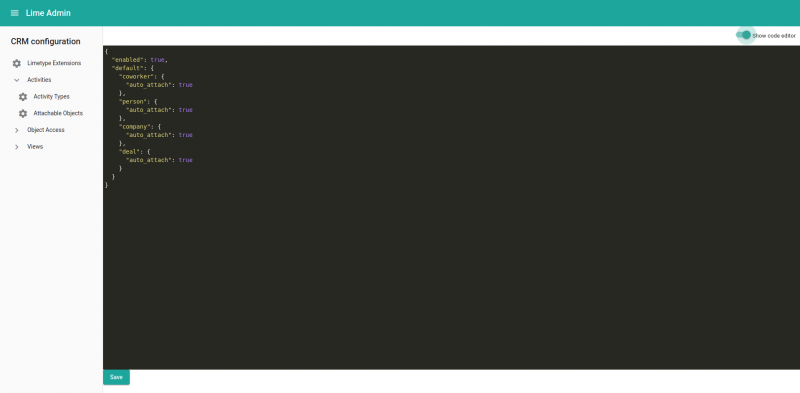 You can configure what limetypes that should be possible to connect an activity to. Therefore go to the “CRM configuration” category, select “Activities” –> “Attachable Objects” to the left and click “Show code editor” to access the json configuration.