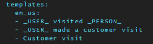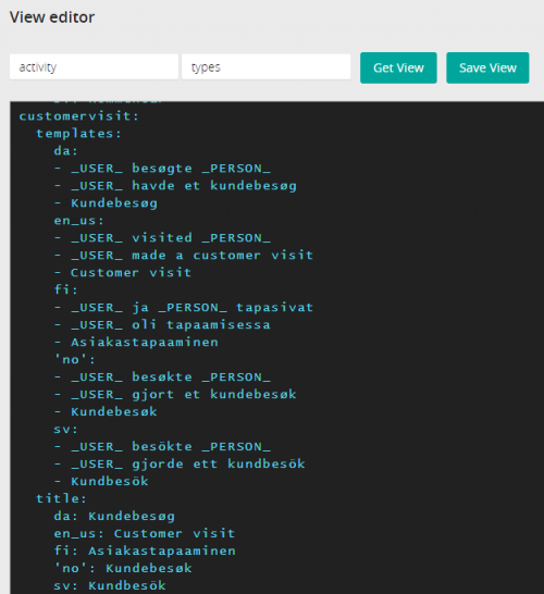 - Localized templates. Under the section “templates” you can specify how the activity should be presented in the activity feed in different languages (english, danish, norwegian, swedish and finish). For each language, separated with the language code according to the example, it's possible to rank the order in how the activity should be presented. It is also possible to use field codes for person and user. This means that _PERSON_ will be changed to the connected persons name in the activity feed, while _USER_ will be changed to the name of the user who created the activity.