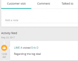 The configuration of activity types according to the example above results in the activity “Customer visit” in the activity feed as the one below in english.