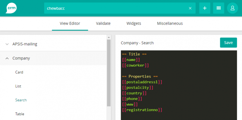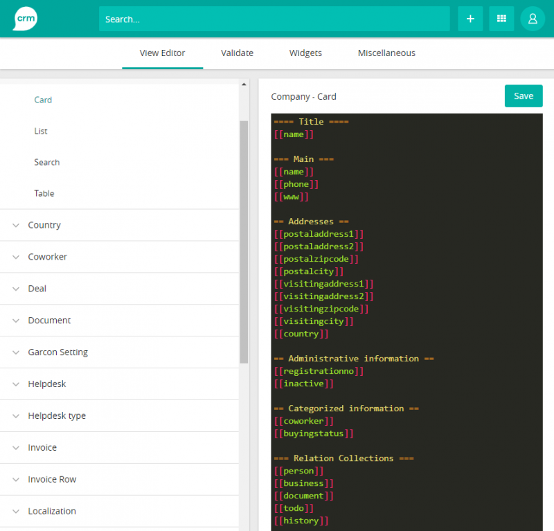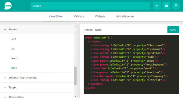 In the administrators page, press “Views” on the left side of the page in the “CRM configuration” category. Here you can choose limetype (for example “Company”) and view type (for example “Card”). When selecting the view you want to edit, the form will show in the middle of the page.