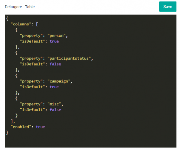 It is also possible to configure what columns in the table view should be in the default view by the isDefault property. isDefault = “1” means that the column is part of the default view.