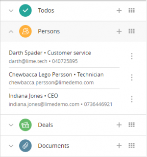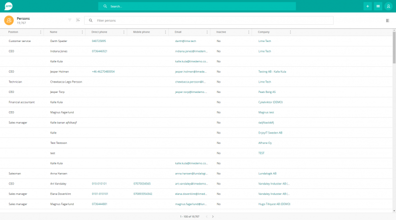 The table views describe what information is shown in the tables for each limetype in the web client. It is possible to go to the table for a specific limetype through the table icon in the header of the application. It is also possible to go to table for a specific set of records of a limetype from the icon on the related view, for example go to the table to show all persons for a specific company.
