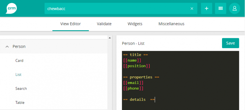 The view consists of two different sections. For each section, you write the database name of the fields in brackets (for example [[name]]) that you want to show from top to bottom.