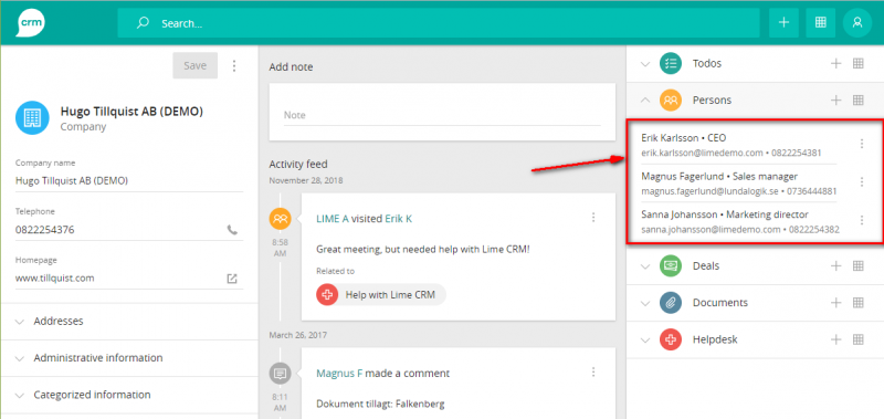It is possible to search for information in related objects. If, for instance, a person is connected to the company “Lime Technologies”. That person is now part of the result for the query “Lime Technologies”.